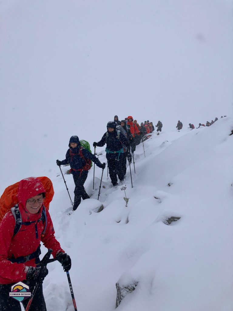 Der E5 ist hier im hochalpinen Gelände angekommen. Der Weg schlängelt sich im Geröll nach oben und der Anspruch ist hier schon bei normalen Wetterbedingungen hoch. Wir haben aber Nebel, leichten Schneefall und knapp unter 0 Grad. Ohne Grödel (also Leichtsteigeisen) wäre hier kein Weiterkommen. Wir sind absolut froh, dass wir einen Guide dabei haben, der uns sicher in Richtung Hütte bringt. Im Mittelteil des Aufstieges muss man kurzzeitig auf der Not-Talabfahrt laufen, das ist heute eine echte Wohltat. Einfach mal 20min ohne Konzentraion vor sich hin laufen.