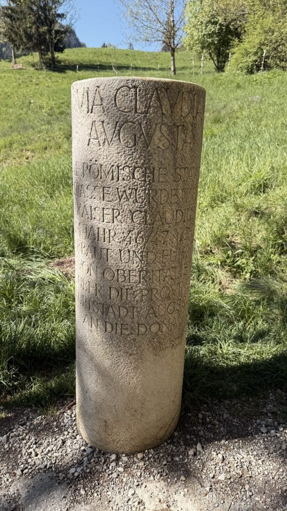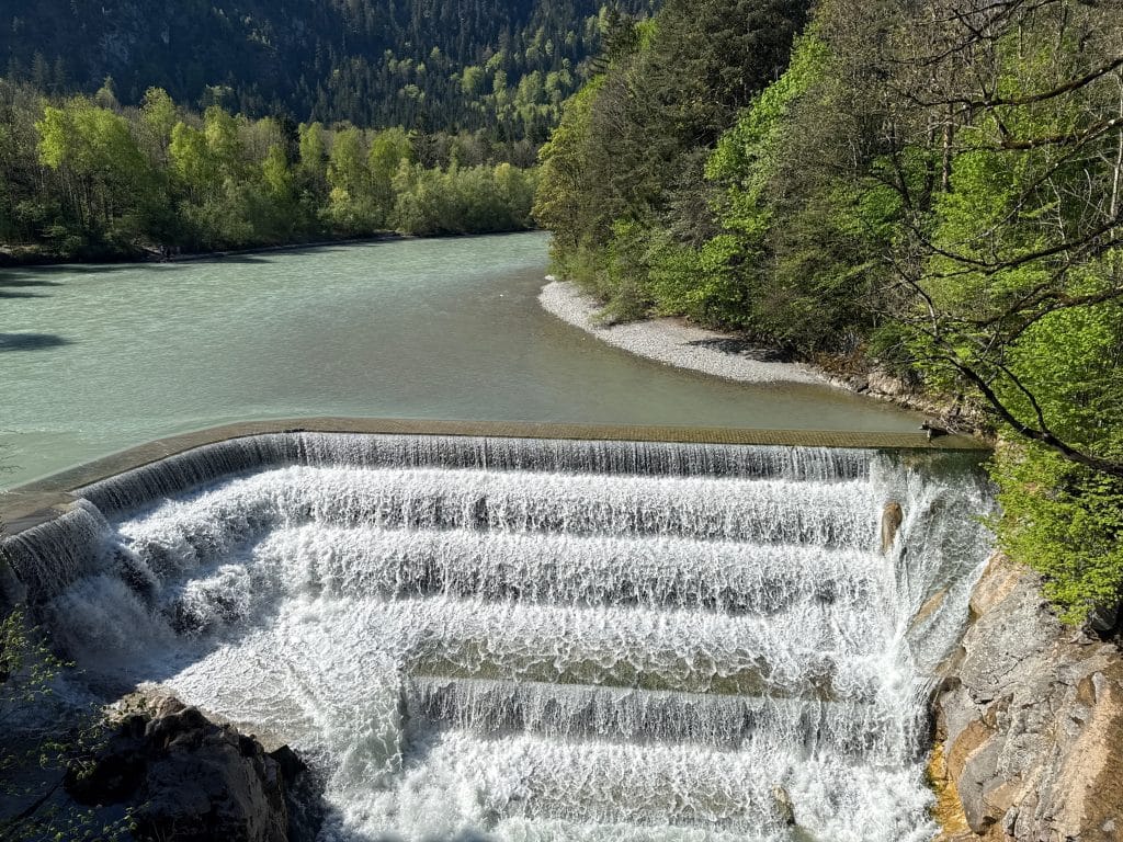 Nachdem ich das Rad abgeladen und alle Taschen soweit verstaut hatte, ging es dann endlich los. Mit dem eBike erst einmal gemütlich durch Füssen und in Richtung Lech. Direkt am Ortsende von Füssen dann gleich das erste Highlight – der Lechfall mit der davor liegenden Schlucht. Über die Maximilian-Steg kann man das Schauspiel gut beobachten, schöne Fotos machen und den nahe liegenden Gedenkstein der Via Claudia besuchen. Das war sozusagen mein interner Start.