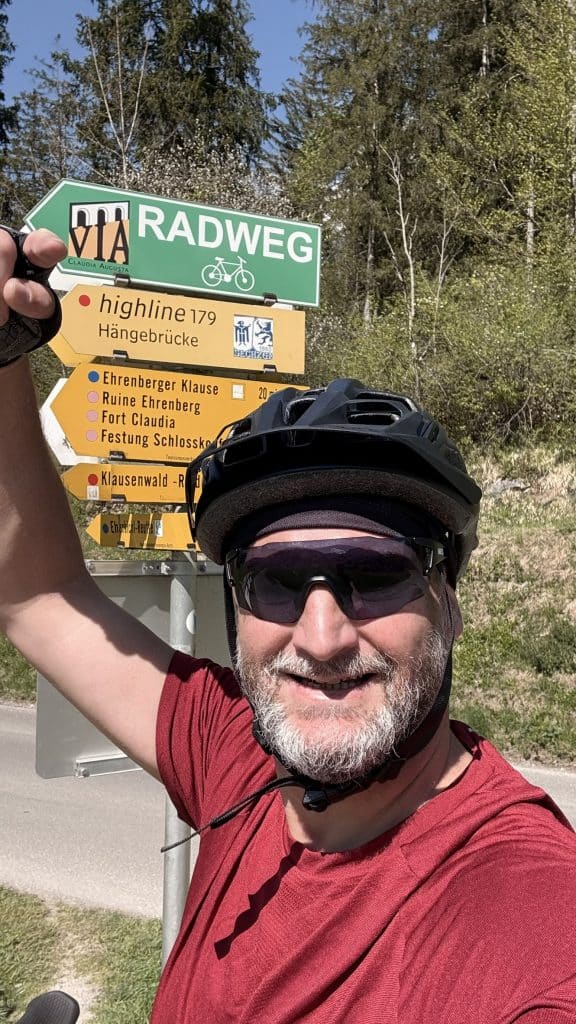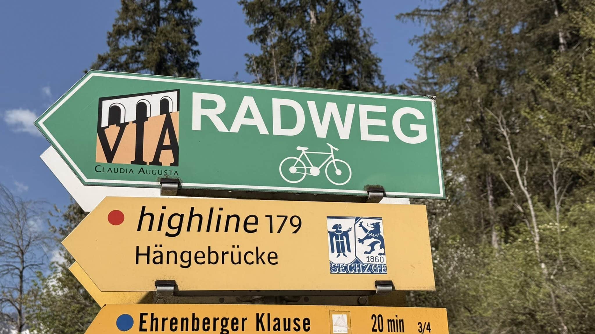 Von hier muss man wenige Meter auf der Landstraße mit dem Rad fahren. Ab dem Parkplatz des Walderlebniszentrums geht dann ein wunderschöner Radweg los. Der Radweg trifft mit der Lechbrücke dann wieder auf die Bundesstraße, die in Richtung Fernpass geht. Hier sehe ich schon die KFZ-Schlange, die sich ins Tal schlängelt. Zum Glück habe ich freie Fahrt und kann gemütlich die alte Landstraße entlang in Richtung Reutte radeln. Der Radweg verläuft hier immer mal wieder auf der Landstraße oder paralell über Forst und Landschaftwege. Aber immer perfekt ausgeschildert.