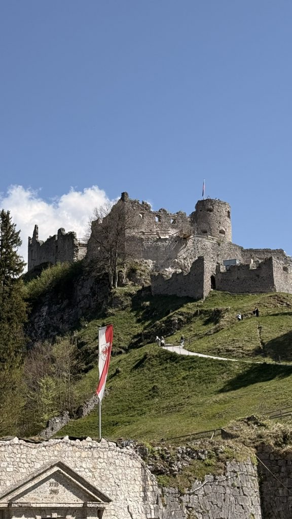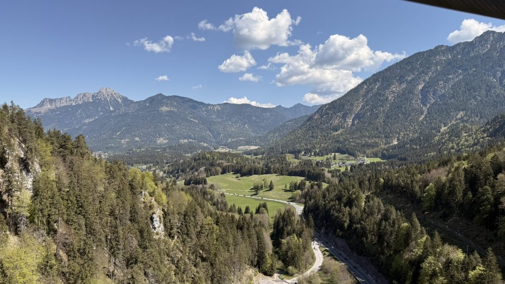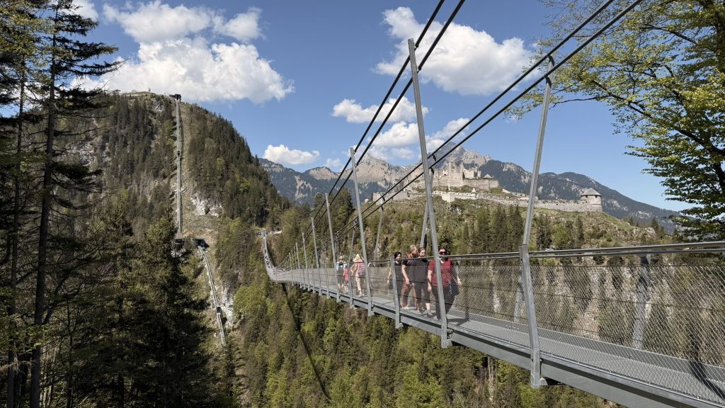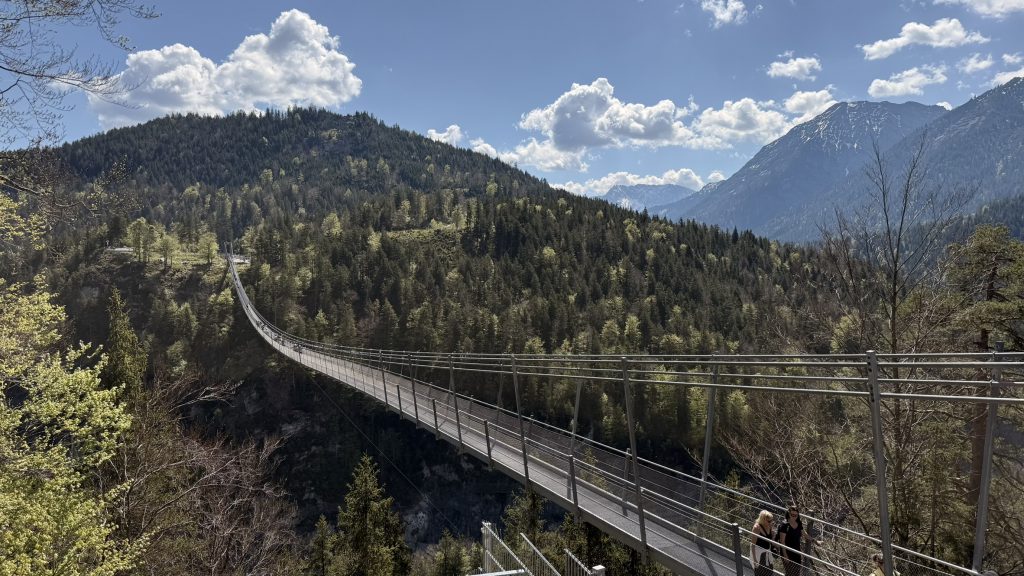Kurz vor Reutte unterquere ich nochmal die Bundesstraße und fahre über Wohngebiete und ein kleines Sport- und Industriegebiet nach Reutte rein. Der Ort ist auch schnell durchquert und bevor ich weiter Richtung Heiterwang und Fernpass fahre, mache ich ich einen Stopp an der Highline179 – die Hängebrücke, die sich hier in 114m Höhe über das Tal spannt. Die Brücke verbindet auch das Fort Via Claudia mit der Burg Ehrenberg.