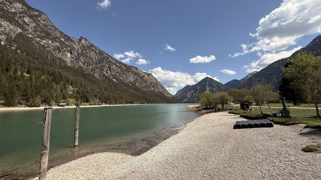 Die Verbindung vom Parkplatz Highline bis vor Heiterwang ist wahrlich keine schöne Strecke. Trostloser, grober Schotter macht das radeln sehr schwer und landschaftlich ist das wirklich nicht schön. Aber das betrifft ja nur ca 1-2 Kilometer. Ich weiche hier von der eigentlichen Route ab und fahre einen Abstecher zum Heiterwanger-See. Eigentlich möchte ich hier eine Pause einlegen und etwas essen. Aber die frühe Jahreszeit macht mir einen Strich durch die Rechnung. Kiosk und Gaststätte haben noch geschlossen…. Trotzdem mache ich eine kleine Pause und setze mich an den See mit einem wunderschönen Ausblick.