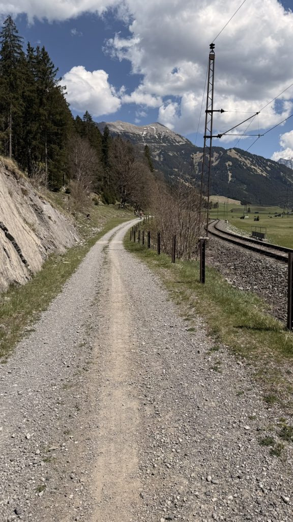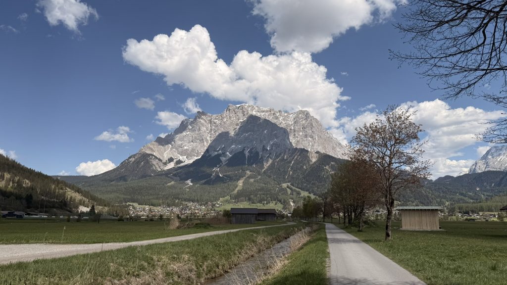 Von hier ab geht der Radweg immer an den Bahnlinien entlang. Ohne große technische Anforderung und ohne Steigungen geht es zwischen Wiesen und Weiden in Richtung Zugspitzgebiet. Schon früh merke ich, dass meine Zeitplanung deutlich zu pessimistisch war und ich viel früher in Ehrwald ankommen werde.